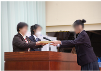 12月8日(月)、全校朝会で座間市人権擁護委員の方にお越しいただき座間市人権作文・ポスターコンテストについて、表彰式が行われました。作文部門で3年生女子の「世界は同じただ一つ」、「みんな違ってみんないい」の2つの作文が会長賞に、ポスター部門で2年生女子の「虹色の世界」、「SNSにも人権はある」の2つの作品が会長賞を受賞しました。