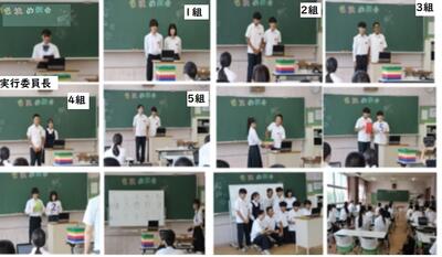 6月30日、体育祭の色決朝会が行われました。3年生各クラスの色長、団長が教室に集まり、リモートの形で各教室に配信されました。初めに各クラスごとに色長、団長からの意気込みが伝えられ、その後、くじ引きにより色が決められました。結果は、1組:緑、2組:赤、3組:黄、4組:白、5組:青に決定しました。いよいよ、体育祭への取り組みが本格的に始まりました。